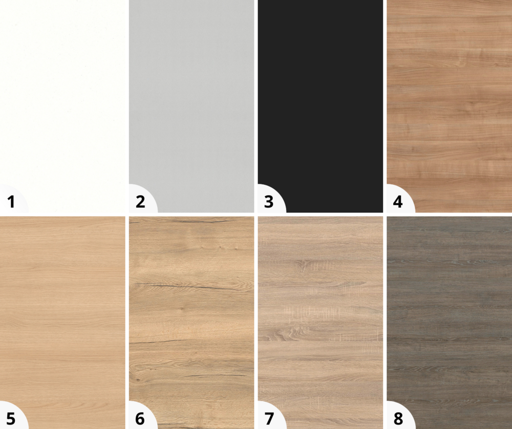 Farben: ❶ Weiß ❷ Hellgrau ❸ Schwarz ❹ Havanna ❺ Eiche hell ❻ Eiche natur ❼ Eiche mittelhell ❽ Eiche braun