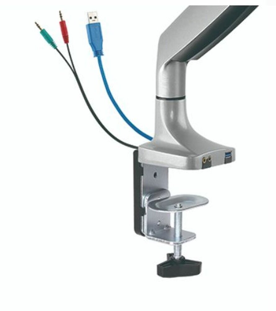 Silberfarbener Monitorarm für 1 Bildschirm: Ein besonderer Monitorarm, da dieses Modell mit USB- und Audioanschluss ausgestattet ist. Beim Arbeiten ganz einfach Musik hören. Dieser Monitorarm passt hervorragend in ein modernes Arbeitsambiente. Der USB-3.0- und der Audioanschluss des Einzel-Monitorarms sind zur Unterstützung von Datenübermittlungen geeignet, zum Aufladen von Endgeräten, Headsets und Mikrofonen geeignet.