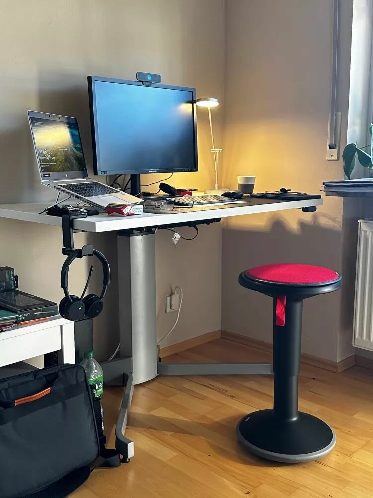 Die platzsparende Homeoffice Lösung, sogar höhenverstellbar mittels Conset Säule.