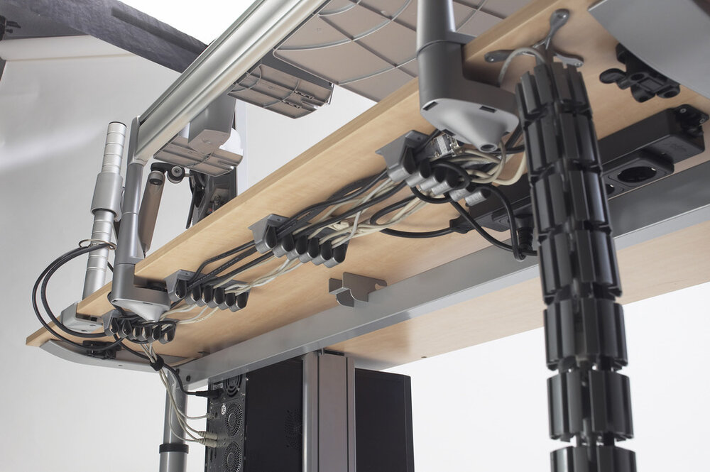 Sehr schnelle Methode, Kabel unter der Arbeitsplatte ordentlich zu verlegen. Der Kabelhalter ist mit 6 Senkschraubenlöchern versehen.