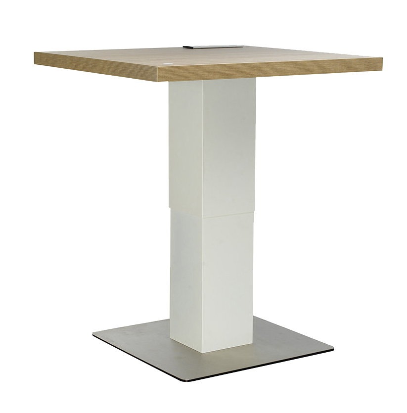 Säulentisch Linak Bary ist schön fertig mit 2 Seitenabdeckungen und hat eine Grundplatte von 74 x 74 cm. Die Bodenplatte steht auf 4 kleinen verstellbaren Füßen, so dass der Strom gut unter der Platte verborgen werden kann.