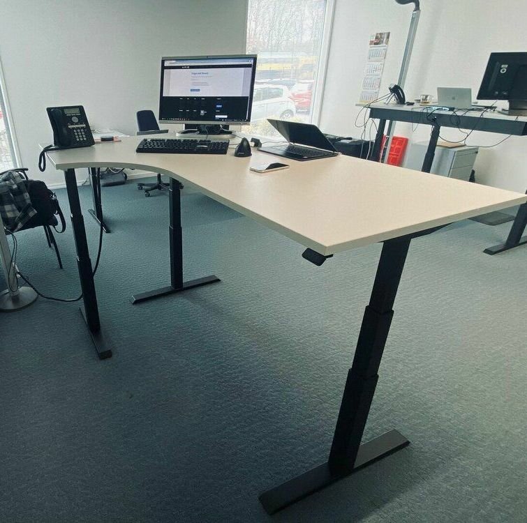 An dem Höhenverstellbarer Eckschreibtisch SteelForce 671 können Sie alle Ecken im Raum überblicken! Der Sitz-Steh-Ecktisch ist sehr stabil und bietet eine große Arbeitsfläche. Der Gestell ist in Weiß, Silber oder Schwarz erhältlich. Die breiten Tischbeine sorgen für eine tolle Optik an Ihrem (Heim-) Arbeitsplatz. Die Motoren sind in den Tischbeinen ansprechend versteckt und sorgen für eine flüsterleise Höhenverstellung.