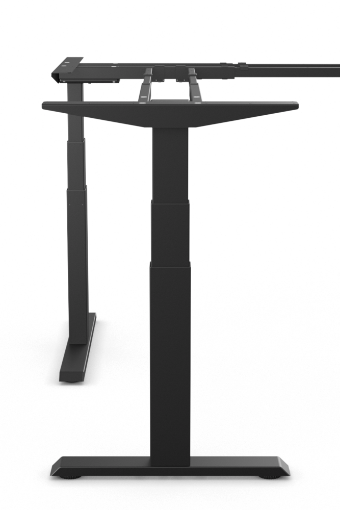 Der Steelforce 671 ist ein sehr stabieler Sitz-Steh-Eckschreibtisch. Das Gestell besteht aus aus Stahl mit drei 10 x 6 cm breite Stahlbeinen. Sie können problemlos eine große Ecktischplatte montieren.