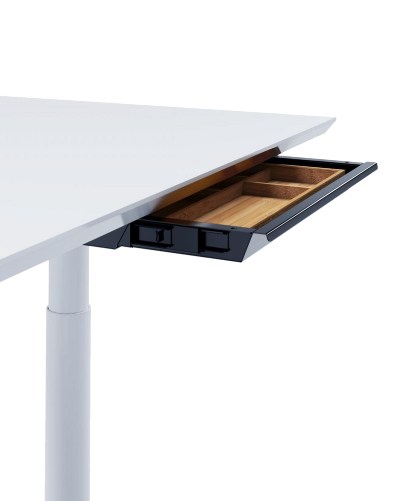 Eine Schublade für Ihr Briefpapier. Mit Zubehörablage aus nachhaltigem Bambus. In 3 Farben erhältlich. Diese Stiftschublade lässt sich einfach unter der Schreibtischplatte montieren.