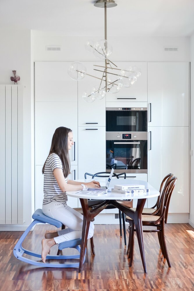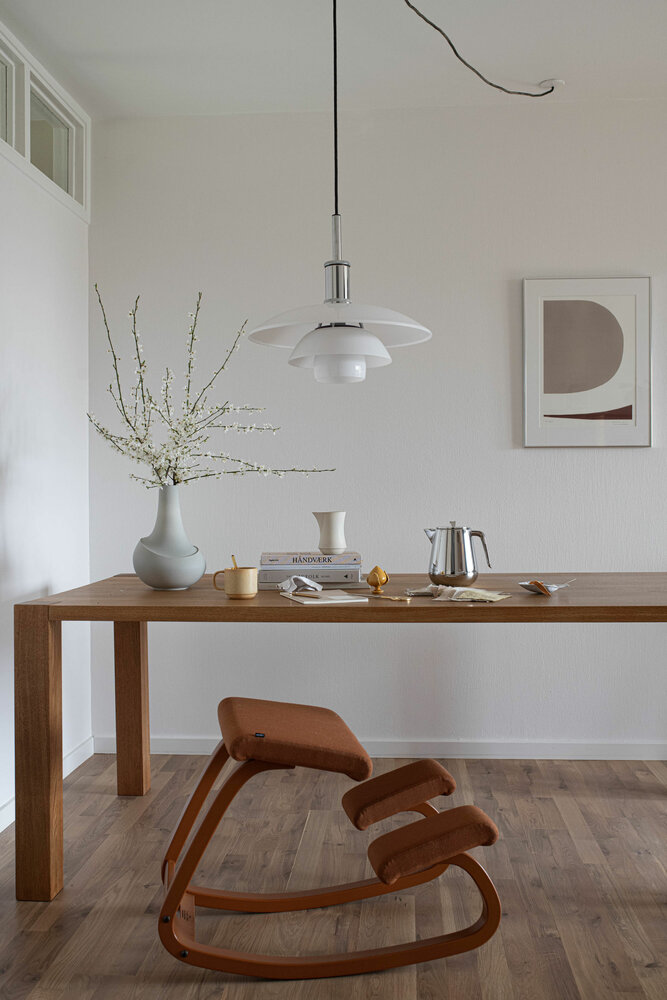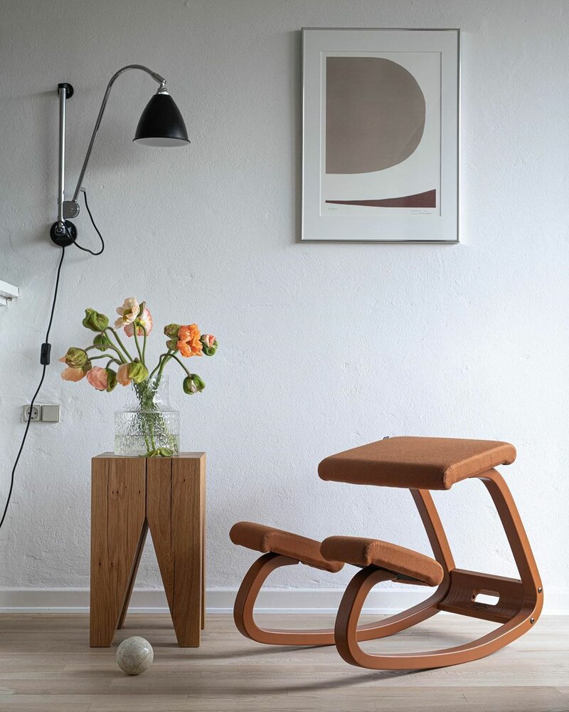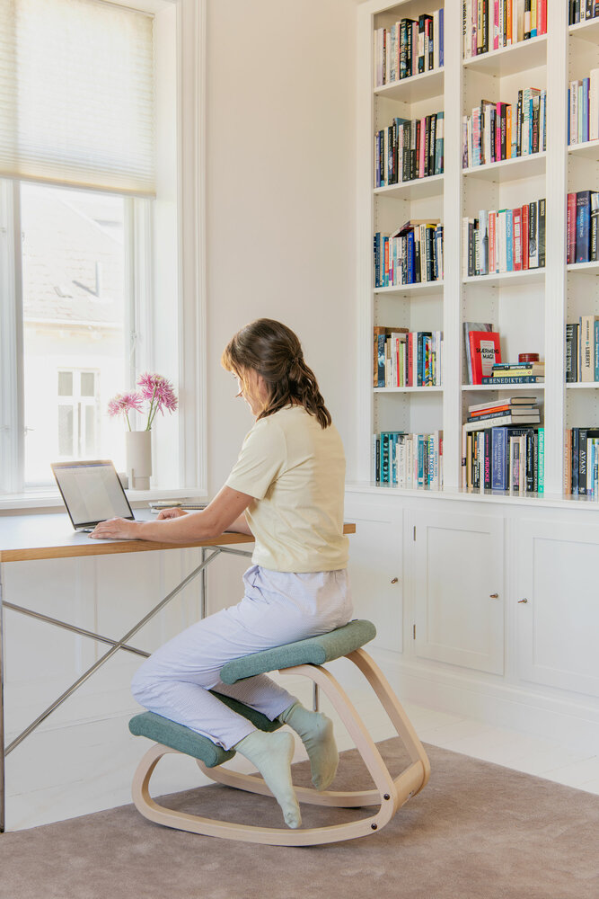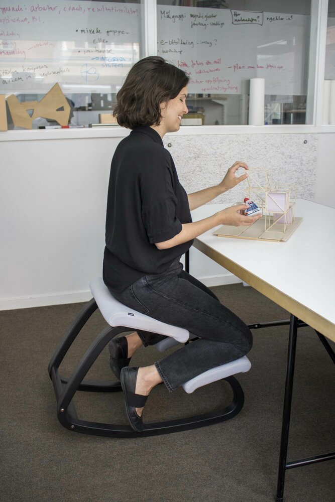 Die Position, die Sie in diesem variablen 'Kniestuhl' von Varier™ einnehmen, sorgt für eine natürliche Krümmung des Rückens und verbessert die Atmung aufgrund des offenen Winkels zwischen Rumpf und Oberschenkeln. Wir nennen diesen Stuhl auch einen Balance-Stuhl.