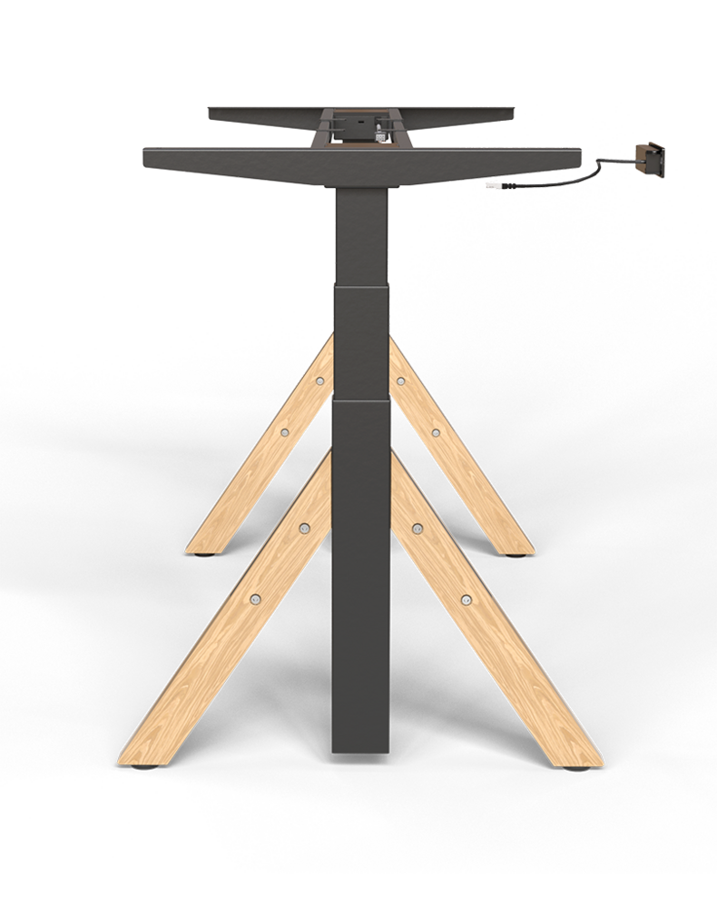 Stilvoller Sitz-Steh-Schreibtisch mit schwarzem oder weißem Metallgestell und schrägen Eichenholzbeinen. Elektrisch höhenverstellbar mit Memory-Funktion, passt in jedes Interieur.