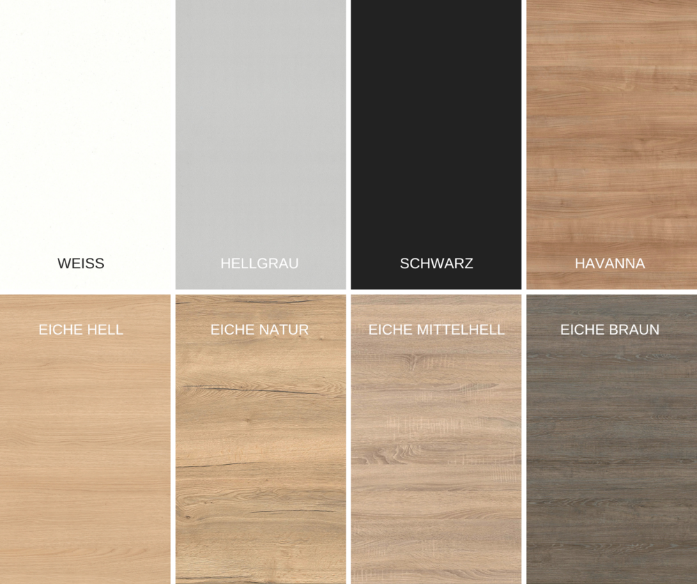 Farben: ❶ Weiß ❷ Hellgrau ❸ Schwarz ❹ Havanna ❺ Eiche hell ❻ Eiche natur ❼ Eiche mittelhell ❽ Eiche braun