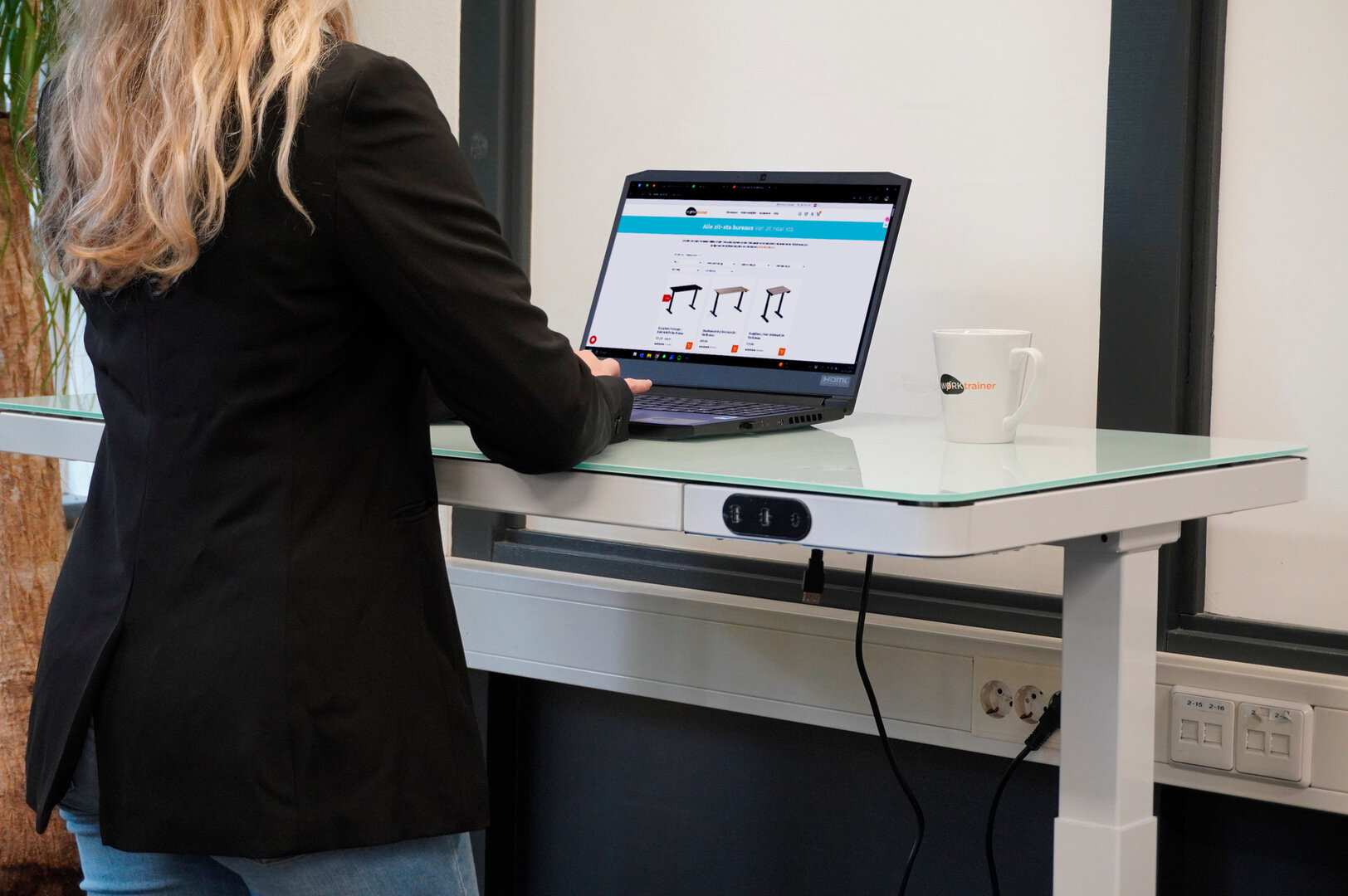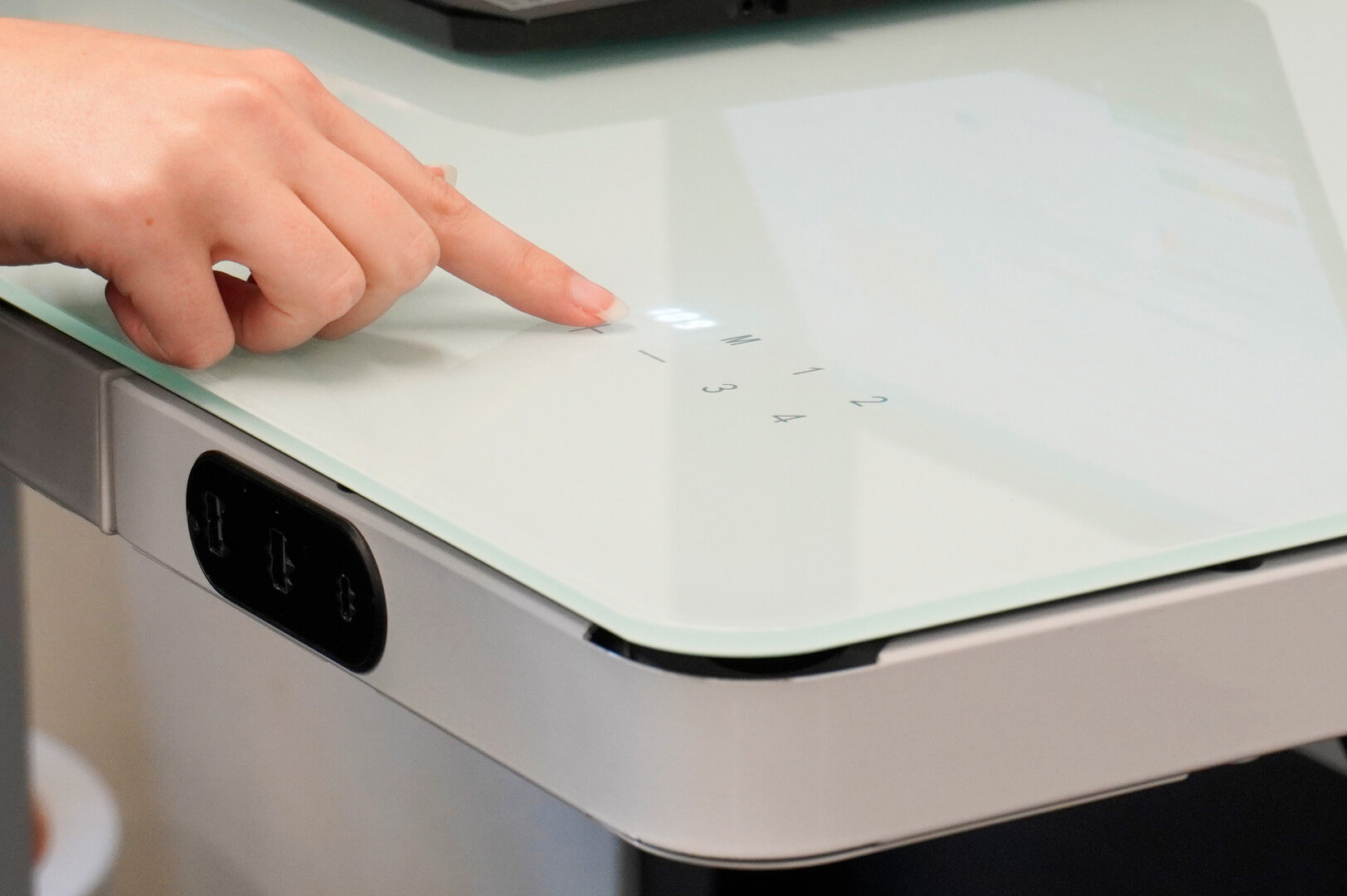 Die Glas-Tischplatte macht diesen Schreibtisch zu etwas Besonderem. Sie ist stabil, elegant und mit einem Whiteboard-Marker beschreibbar – perfekt, um Ideen sofort festzuhalten. Anschließend einfach abwischen und mit frischem Kopf weitermachen. Die Steuerung für die Höhenverstellung ist dezent in die Platte integriert, was dem Design einen aufgeräumten, minimalistischen Look verleiht.